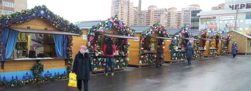 Чудесные ярморочные домики стоят у метро Новые Черёмушки.